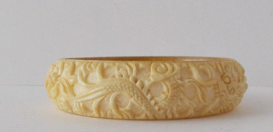 Antique Vintage Bangle Bracelet Carved Dragons Ivory color Cross Slice Tusk Horn