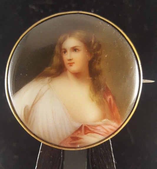 Antique Rare Flora After Titian Miniature Portrait Porcelain Brooch Cameo