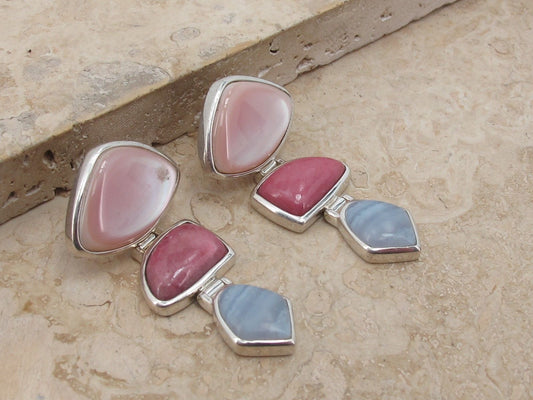 Sterling Silver 925 Mother of Pearl banded Jasper & Pin Agate Hinged Earrings