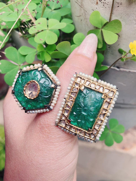 Vintage Carved Emeralds Uniquely Designed Gold Filled Ring with Uncut Diamonds & Pearls